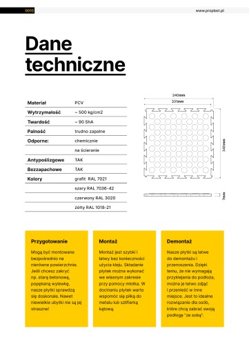 Bardzo wytrzymałe modułowe płytki podłogowe proplast wykonane z PVC do szybkiego i łatwego montażu typu puzzle . Idealne zarówno do remontu starych i zniszczonych posadzek i podłóg, jak i pokrywania nowych powierzchni. Bez problemu wytrzymują obciążenia ciężkich wózków widłowych, samochodów, samochodów ciężarowych, maszyn produkcyjnych i maszyn rolniczych.