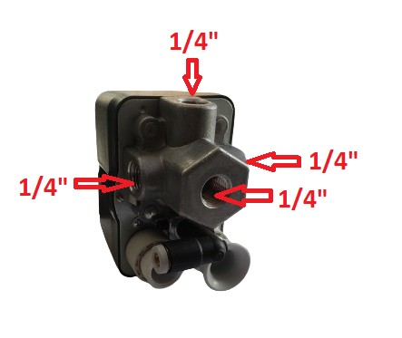 - wyłącznik posiada przyłącza: 1/4" od spodu oraz 3 przyłącza boczne 1/4" (1/4" = około 11,7 mm mierząc wewnątrz gwintu)