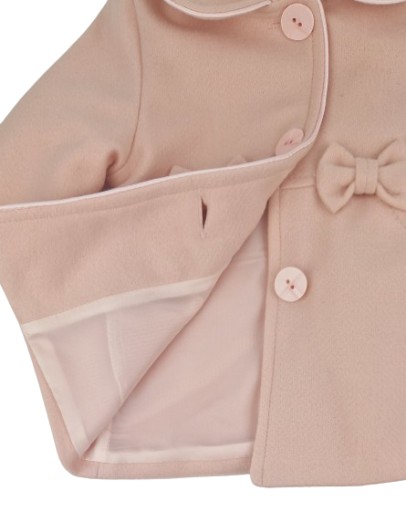Płaszcz zdobią delikatne kokardki umieszczone z przodu i tyłu, nadając mu wyjątkowego uroku i dziewczęcego charakteru. Różowy kolor nadaje mu subtelności i sprawia, że jest doskonałym wyborem dla maluchów, które kochają pastelowe odcienie.