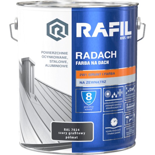 RAFIL Radach Farba Na Dach to wysokiej jakości farba do malowania dachów, rynien i parapetów. Produkt 2 w 1: grunt + farba. Zapewnia podwyższoną ochronę przed działaniem zmiennych warunków atmosferycznych i promieniowaniem UV. Ma zastosowanie zarówno do wykonywania nowych wymalowań, jak i renowacji starych powłok malarskich. Cechą szczególną jest doskonała przyczepność do podłoża oraz wysoka odporność na działanie korozji, światła, wody i innych czynników atmosferycznych.