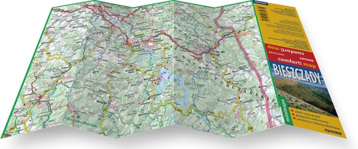 • mapa Bieszczadów w skali 1:200 000 (1 cm – 2000 m) z zaznaczonymi szlakami pieszymi wraz z podanymi czasami przejść, schroniskami, wyciągami narciarskimi, a także cieniowaniem plastycznie pokazującym rzeźbę terenu,