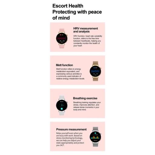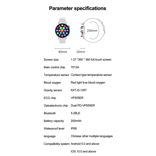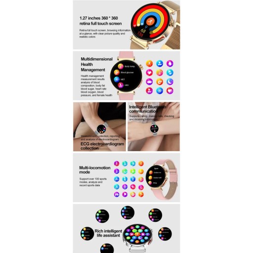 Cechy: Kobiecy styl (rozmiar w kolorze złotym o średnicy 40 mm), funkcja EKG, połączenie bezprzewodowe, nieinwazyjny poziom glukozy we krwi, skład krwi (funkcja lipidów kwasu moczowego), skład ciała BMI tkanki tłuszczowej, funkcja HRV, diagnostyka medyczna AI, funkcja Metto, Funkcja połączenia alarmowego SOS, temperatura, zawartość tlenu we krwi, ciśnienie krwi, trening oddechowy, stres, zdrowie kobiet (śledzenie okresu), tętno, sen, przypomnienie o siedzącym trybie życia i other funkcje zdrowotne. Liczenie kroków/kalorie/dystans, tryb multi-motion, sterowanie muzyką, prognoza pogody, inteligentny asystent głosowy, gry, latarka, odtwarzanie muzyki;