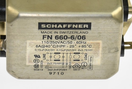 Używany, całkowicie sprawny, bardzo dobrej jakości element o symbolu: FN 660-6/06, produkt firmy SCHAFFNER. Filtr przeciwzakłóceniowy, jednofazowy dla napięcia do 250V i dla prądu do 6A. Pochodzi z demontażu całkowicie sprawnych maszyn przemysłowych.