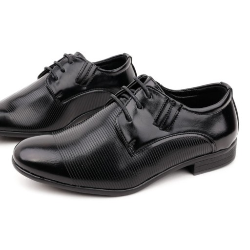 Półbuty młodzieżowe na płaskiej podeszwie. Klasyczny okrągły nosek. Wykonane z lekko świecącej ekoskóry. Wkładka skórzana, która zapewni komfort podczas użytkowania. Wiązane na cienkie sznurowadła. Można je nosić do garnituru, na ważną uroczystość.