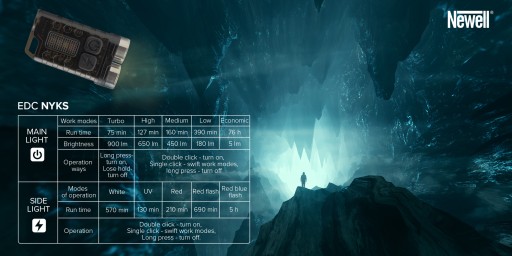 Jak przystało na nowoczesną latarkę do codziennego użytku i zadań specjalnych, model Newell EDC Nyks wyposażono w nowoczesne diody LED pozwalające uzyskać maks. strumień świetlny na poziomie aż 900 lumenów. To imponujący wynik, jeśli weźmiemy pod uwagę niewielkie wymiary urządzenia. W trybie turbo lampka może z powodzeniem konkurować z wieloma popularnymi latarkami taktycznymi o większych gabarytach. Dzięki zastosowaniu technologii LED Nyks nie tylko osiąga duży poziom jasności, ale także utrzymuje efektywność energetyczną. To oznacza, że niezależnie od tego, czy używasz latarki do oznaczania szlaku, czy do codziennych zadań, możesz mieć pewność, że imponująca moc lampki będzie zawsze dostępna w zasięgu Twojej ręki.