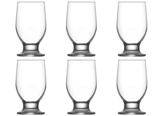 Zestaw 6-ciu szklanek na stopie do soku wykonanych z grubego szkła produkcji tureckiej. Szkło eleganckie przejżyste szklanki solidnie wykonane.