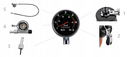 - PROSTA ZASADA DZIAŁANIA – licznik napędzany jest przez linkę nazywaną potocznie ślimakiem, którą podłącza się do przedniej piasty zaraz za widelcem – amortyzatorem. Końcówka ślimaka zaczepiana jest o szprychę, w momencie gdy koło się kręci przekładnia ślimaka zaczyna obracać linkę i sprawia, że mechanizm zaczyna działać. Licznik pokazuje prędkość do 60km/h wraz z obrotami oraz całkowitą ilość przejechanych kilometrów.