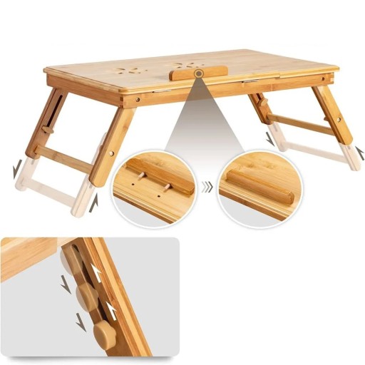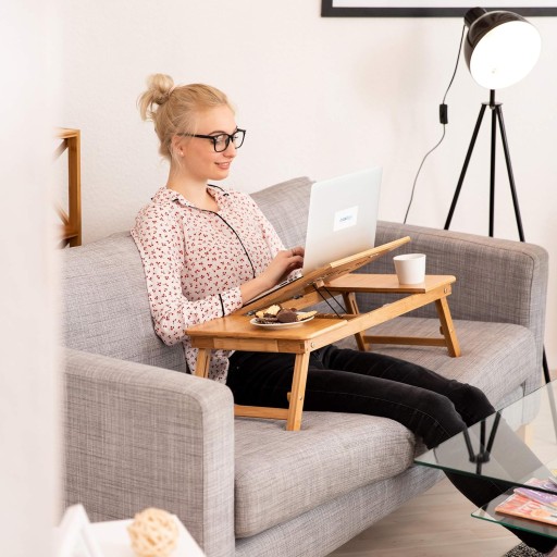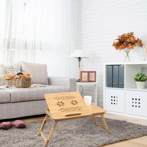 Wygodny i praktyczny stolik pod laptopa z wentylacją to akcesorium, które doceni każdy, kto lubi pracować przy komputerze w wygodnej, luźnej pozycji. Niestety korzystanie z laptopa w łóżku czy na kanapie wiąże się często z trzymaniem go na kolanach, przez co nie tylko jest nam niewygodnie, ale również możemy doprowadzić do przegrzania urządzenia. Bambusowy stolik pod laptopa zda egzamin zarówno w łóżku, jak i na kanapie, a także w samolocie, pociągu i autobusie. Dzięki otworom znajdującym się w blacie, możemy spokojnie okryć się ulubionym kocem i położyć komputer lub tablet na wentylowanym stoliku pod laptopa – tu z pewnością się nie przegrzeje. Otwory w blacie odprowadzają ciepło, dzięki czemu bateria komputera będzie dłużej działać i urządzenie nie zniszczy się.
