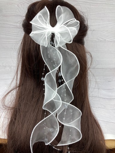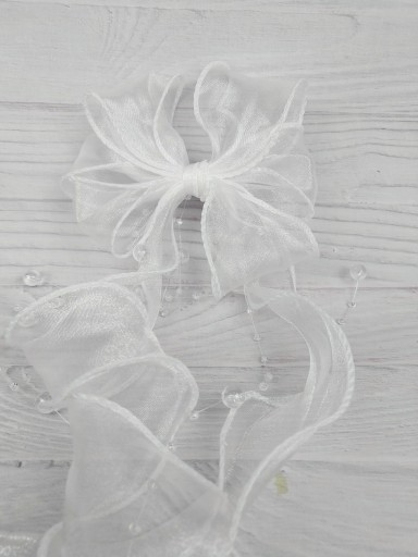 Wykonana z szyfonowej wstążki, z przezroczystymi koralikami.