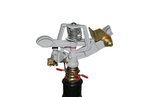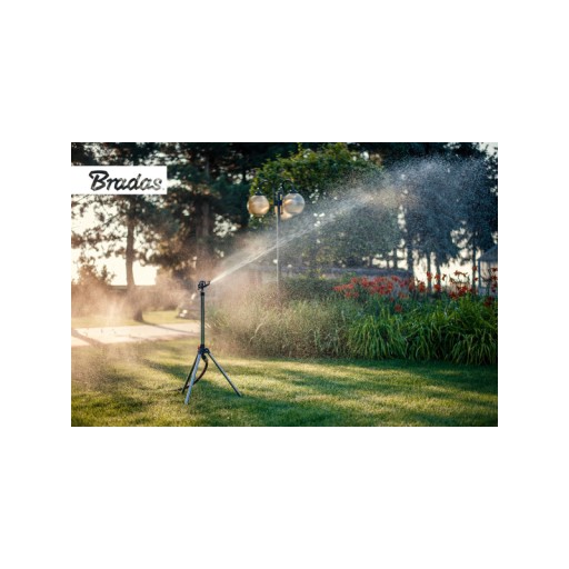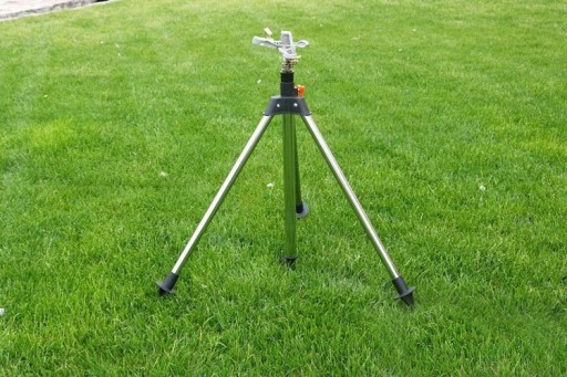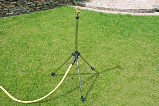 - Zraszacz mosiężny, obrotowy. Zamontowany na statywie. Możliwość regulacji powierzchni zraszania. Doskonały do zastosowania w sadach i ogrodach.
