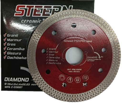 Tarcze diamentowe firmy STEERN wykonane z wysokiej jakości diamentów syntetycznych regularnego kształtu oraz najwyższej jakości wiązania są narzędziami wysokiej klasy produkowanymi w oparciu o procesy najnowocześniejszych osiągnięć techniki. Dzięki zastosowaniu najlepszej jakości diamentów, tarcza charakteryzuje się wysoką wydajnością cięcia. Stabilny korpus tarczy zapewnia optymalny ruch obrotowy. Tarcze te cechują się wysoką jakością cięcia. Zaprojektowane są pod kątem dużej wydajności przy jak najmniejszym koszcie.