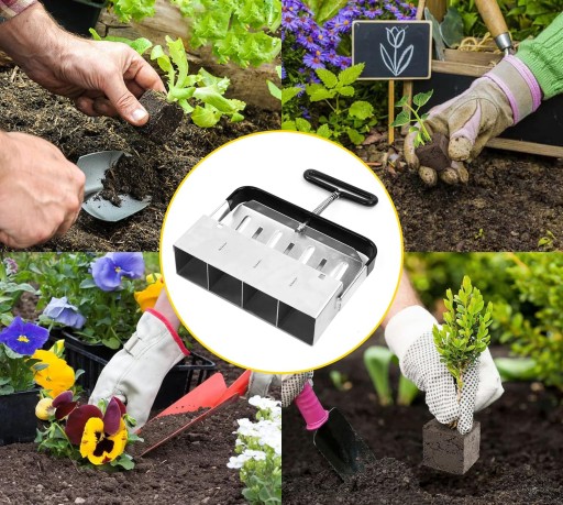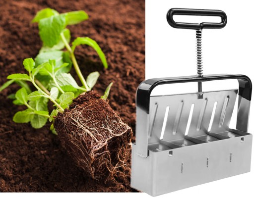 Narzędzie do tworzenia bloków gleby do sadzonek. W łatwy i szybki sposób pozwala na utworzenie 4 bloków o wymiarach 5,1x5,1x10,1cm.