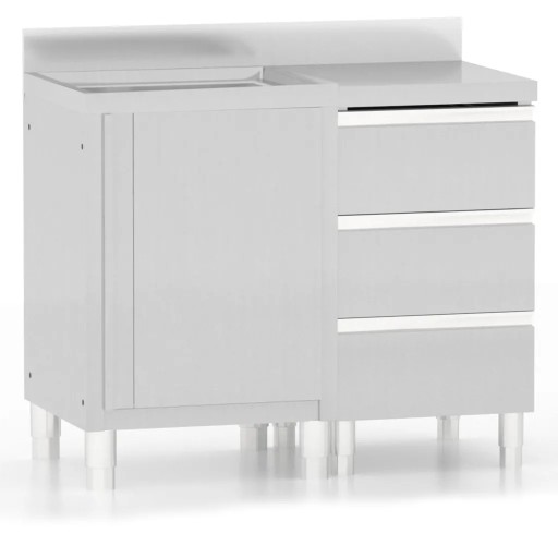 Wykonana z wysokiej jakości stali nierdzewnej szafka jest wytrzymała, antykorozyjna i łatwa do czyszczenia. Zapewnia dużo miejsca do przechowywania sprzętu i akcesoriów do sprzątania. Dodatkowo regulowane nóżki pozwalają wypoziomować szafkę na nierównych podłogach. W zestawie znajduje się również 10-centymetrowy rant ochronny z tyłu i otwór na rurę odprowadzającą wodę.