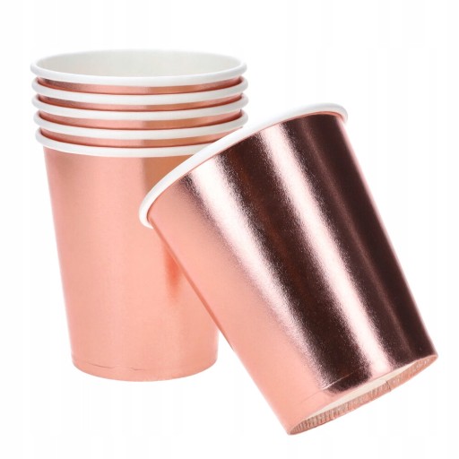 - Kubeczki papierowe w kolorze rose gold. W opakowaniu jest 6 sztuk. Pojemność: 180ml. Nie nadają się do wrzątku. Idealne na soki, lemoniadę, szampana.