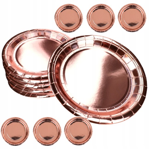 - Talerzyki papierowe. Opakowanie - 6 sztuk. Kolor: Różowe złoto. Średnica: 18cm. Sprawdzą się na deserki, przystawki, owoce.