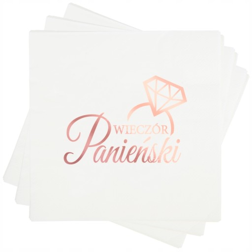 - Serwetki papierowe w kolorze bieli z napisem Wieczór Panieński w kolorze rose gold. Napis przystrojony pierścionkiem z diamentem. W opakowaniu znajduje się 10 sztuk. Wymiary po rozłożeniu: 33x33cm.