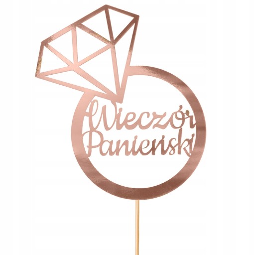 - Topper na patyczku w kolorze różowego złota. Nadruk: Wieczór Panieński w kole z dużym diamentem. Wysokość całkowita: ok. 33cm. Rozmiar nadruku: ok. 14cm x 14cm. Wycięty laserowo.