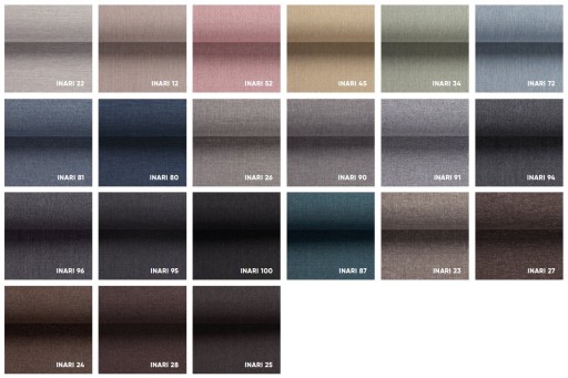 Materiał obiciowy ze splotem imitującym naturalną, lnianą tkaninę. Nitki o różnych odcieniach sprawiają że materiał nie jest jednokolorowy, a to znacznie poprawia walory użytkowe mebla. Proste i mocne tkanie sprawia , że Inari to tkanina wytrzymała i odporna na wycieranie. Idealny materiał do codziennego użytku. Tkanina wspaniale pasuje do mebli o prostych formach oraz zagłówków. Sprawdzi się również jako tkania biurowa. Wysoka odporność na blaknięcie. Czyszczenie za pomocą wody lub delikatnych środków do tapicerek. Nie stosować wybielaczy.