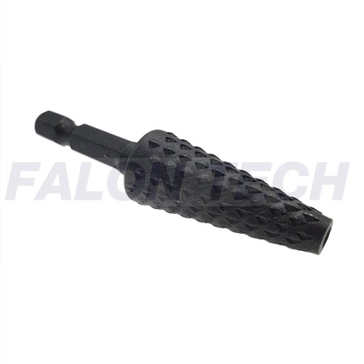Frez stożkowy - zdzierak służy do szybkiej i skutecznej obróbki drewna, w tym do wykonywania wgłębień i szybkiego usuwania zbędnego materiału. Posiada trzpień sześciokątny ¼" dzięki temu współpracuje z większością dostępnych na rynku wiertarek, idealne nadaje się na wiertarki akumulatorowe. Tarnik wykonano ze stali narzędziowej.