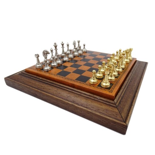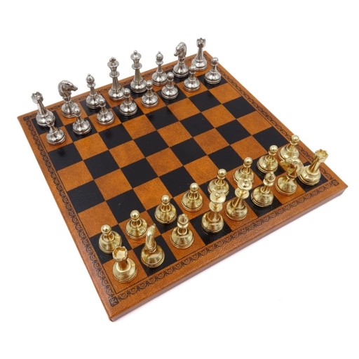 • Kolorystyka: brązowo-czarna szachownica, złocisto-srebrzyste figury