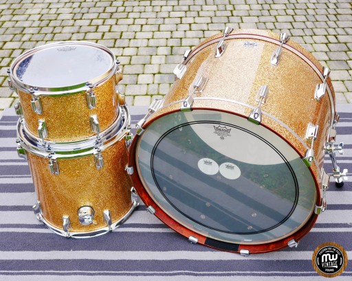 Bębny po kapitalnym remoncie u Fat Flying Drums. Nowy lakier Gold Sparkle, poprawione krawędzie, środki pomalowane na czarno.