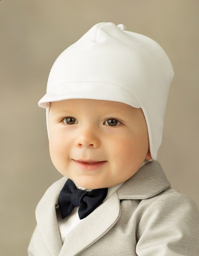 Czapka Krystian to ideale okrycie głowy w chłodniejsze dni. Jest wykonana z białej lekko rozciągającej się tkaniny i ma grubą dzianinową podszewkę. Dobrze przylega do głowy dziecka i zakrywa uszy.