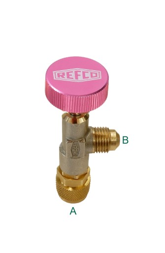 Zawór kątowy Refco do napełniania czynnikiem instalacji chłodniczych i klimatyzacyjnych. Zawór posiada ruchomy popychacz, który otwiera zaworek serwisowy. Dzięki jego zastosowaniu ogranicza się do minimum wyciek czynnika chłodniczego z instalacji.