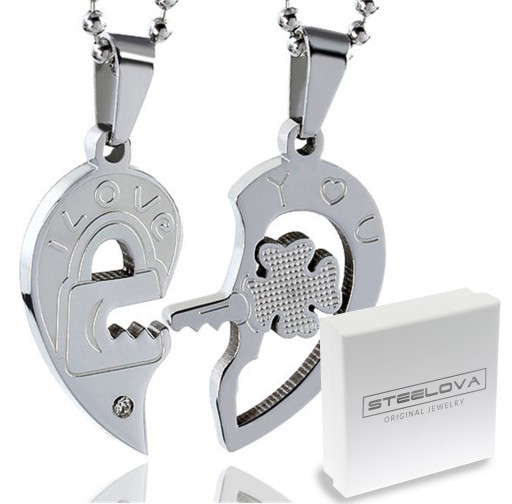 ✅Dodatkowy jedna zawieszka wzbogacona o cyrkonie w białym kolorze, kłódkę z zamkiem na kluczyk oraz napis "I love". Druga zawieszka posiada klucz do zamka w kształcie koniczyny oraz napis "You" z serduszkiem.