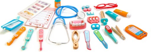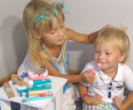 Drewniane narzędzia dla małego dentysty. Ten zestaw zawiera wszystko, czego potrzebuje Twój mały Lekarz do zabawy w dentystę. Przyszli lekarze mogą robić zastrzyki, wyrywać oraz sprawdzać stan zębów u swoich pacjentów. Zabawa w Dentystę to nie tylko jedna z zabaw na odgrywanie ról, to również nauka dbania o higienę oraz skutki jej braku. Uczy także empatii i współodczuwania, co bardzo ważne w relacjach społecznych. Wspiera rozwój wyobraźni i uczy rozwiązywania problemów. Taka zabawa to świetny trening przed wizytą w prawdziwym gabinecie