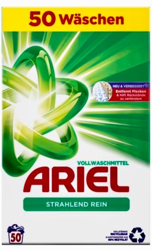Ariel Strahlend Rein to proszek do prania białego. Niemiecki proszek Ariel jest jednym z najskuteczniejszych preparatów na rynku. Niemiecki proszek zapobiega szarzeniu tkanin, a kolory pozwala zachować w intensywnych barwach. Zagraniczny proszek Ariel nadaje się do prania w niskich temperaturach, można prać już w 30 stopniach. Proszek do prania Ariel zapobiega mechaceniu, łatwo rozpuszcza się w wodzie i pozostawia przyjemny zapach.