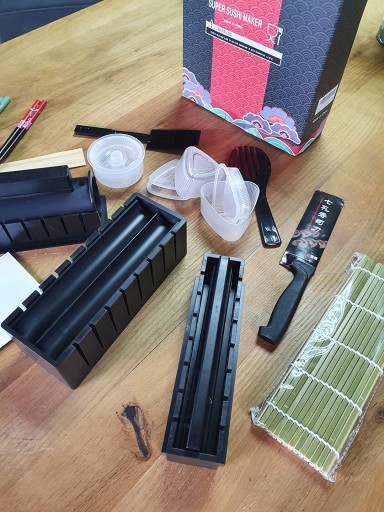 Zestaw zawiera 20 niezbędnych elementów, aby stworzyć wyjątkowe sushi w domu. Znajdziesz w nim m.in. mata bambusowa do zwijania, pałeczki, nóż łopatkę oraz specjalną formę do ryżu.
