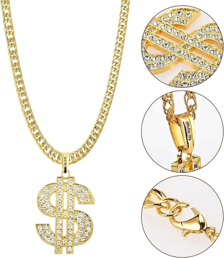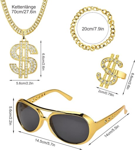 - Zestaw Zawiera: 1 x łańcuszek dolara, 1 x pierścionek dolarowy, 1 x złoty naszyjnik, 1 x okulary vintage.