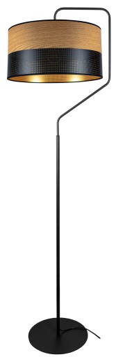 Nowoczesna lampa podłogowa - w czarnym kolorze z abażurem w modnym nowoczesnym połączeniu czerni, złota oraz drewnianego motywu. Designerski styl doskonale wkomponuje się w Twoje wnętrza. Jest uzupełnieniem lamp sufitowych.