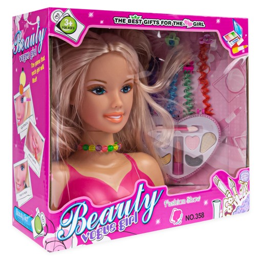 Głowa modelki z długimi włosami umożliwia tworzenie różnorodnych fryzur, a dołączone akcesoria, takie jak paletka cieni i szminka, pozwalają na eksperymenty z makijażem.
