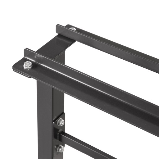 Materiał: stal Wymiary: Długość: 55,5 cm Szerokość: 124 cm Wysokość: 79 cm Rozstaw półki: 13 cm Długość półki: 122 cm Szerokość półki: 22 cm Grubość półki 5 mm Przekrój profili: 50x50 mm Maksymalna waga obciążenia: 500 kg Waga produktu: 25 kg