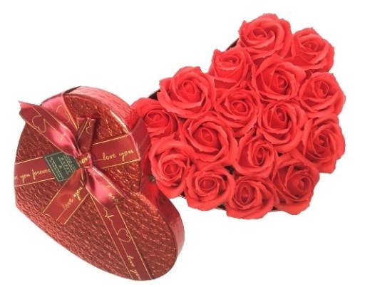 PACHNĄCE KWIATY MYDLANE W PUDEŁKU - RÓŻE CZEROWNE W PUDEŁKU o kształcie SERCE