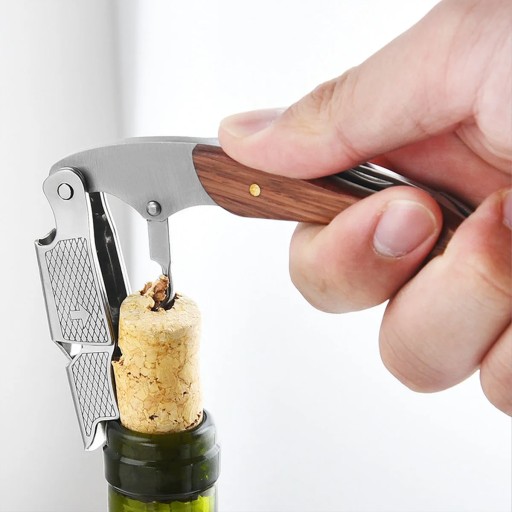 Korkociąg do otwierania wina, butelek a także nóż kelnerski w jednym
