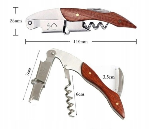 Z jednej strony otwieracz do butelek, z drugiej nożyk umożliwiający przecięcie foli z butelki wina, po środku korkociąg