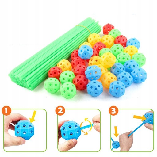 Budowa ze słomek jest bardzo prosta,wystarczy połączyć podłużną rurkę z okrągłym łącznikiem i tworzyć dowolne konstrukcje. łączniki pozwalają na połączenia słomek pod różnymi kątami 45,90 i 180 stopni.