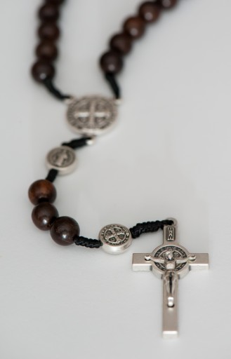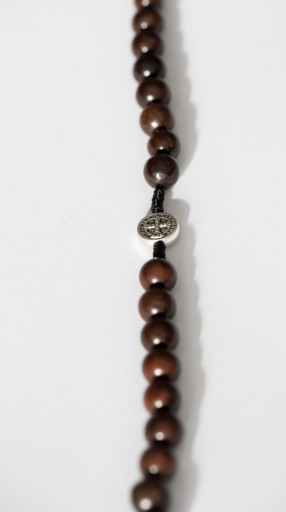 Różaniec św. Benedykta drewniany na sznurku, wykonany z drzewa grusza chińska, krzyżyk oraz łączniki metalowe. Długość różańca ok. 38 cm, średnica koralika ok 8 mm.