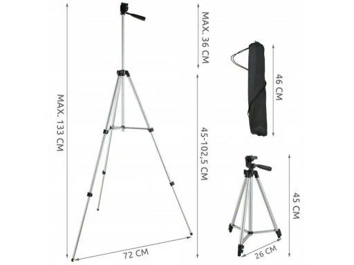 - SPECYFIKACJA – wymiary statywu (wys min/max): 45-133cm; waga zestawu 450g.