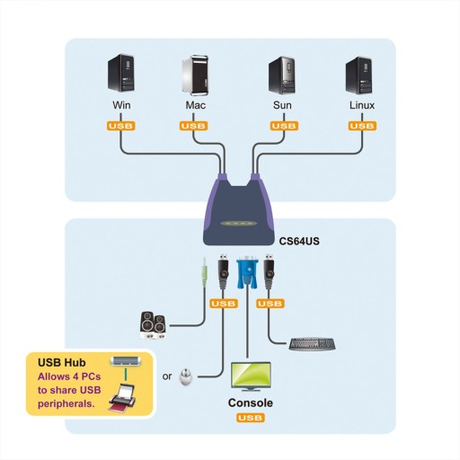Nasze kompleksowe rozwiązanie USB: podłącz cztery komputery z portami USB do jednej konsoli USB, aby uzyskać kompletny system komputerowy USB zgodny ze wszystkimi głównymi platformami: PC, Mac i Sun.