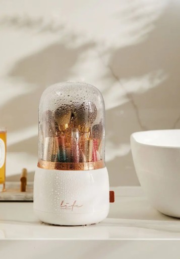 Wysokiej jakości organizer obrotowy na pędzle w kolorze białym. Pomoże Ci zachować porządek oraz czystość twoich pędzli czy drobnych kosmetyków, dzięki obrotowemu systemowi z łatwością znajdziesz to czego szukasz, a przegródki pomogą zorganizować miejsce mniejszych oraz większych przedmiotów. Organizer jest zamykany, co czyni go wodoszczelnym, a jego elegancki wygląd sprawi, ze będzie on stylową ozdobą w Twoim domu!
