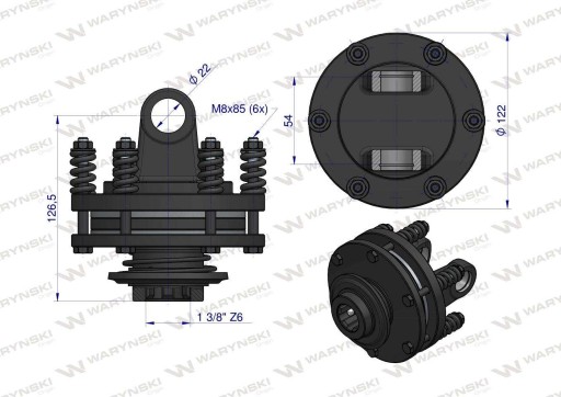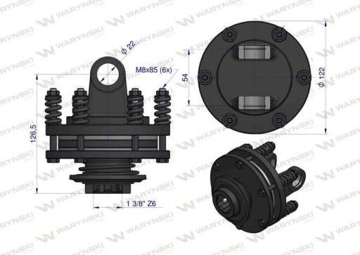 Mocowanie do traktora: 1 3/8" Z6Moc nominalna: 210 NmSprzęgło: Sprzęgło cierneMoc rozłączająca sprzęgło: 300 NmŚrednica łożyska: 22 mmWysokość krzyżaka: 54 mm
