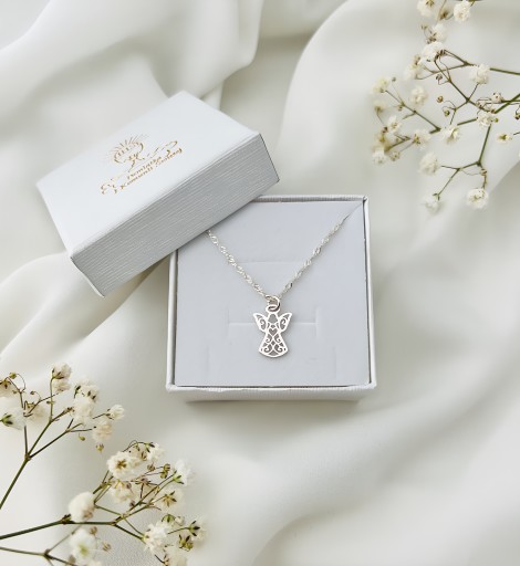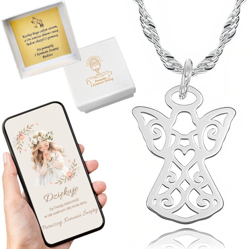 SREBRNY ŁAŃCUSZEK ANIOŁEK ZESTAW ŁAŃCUSZEK Z ANIOŁKIEM NA KOMUNIĘ 40cm