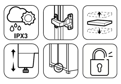 Szafa stoi na pięciu stabilnych nogach, ma podwójne drzwi otwierane na boki za pomocą wygodnych uchwytów. Posiada certyfikat wodoodporności IPX3 oraz wysoką tolerancję na wilgoć i temperaturę.
