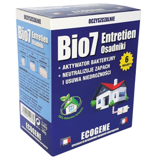 Bio7 Entretien Osadniki (Bio7 Entretien Fosses) to unikalna kompozycja mikrobiologiczna zapewniająca kompleksowe wsparcie poszczególnych etapów oczyszczania ścieków. Preparat zawiera wyselekcjonowane mikroorganizmy oraz immobilizowane enzymy znacznie przyspieszające procesy biochemicznego rozkładu. Dodatek witamin stymulujących wzrost bakterii sprawia, że preparat działa natychmiast i zapewnia stałą aktywność flory bakteryjnej w osadniku.