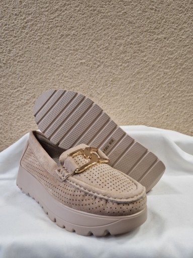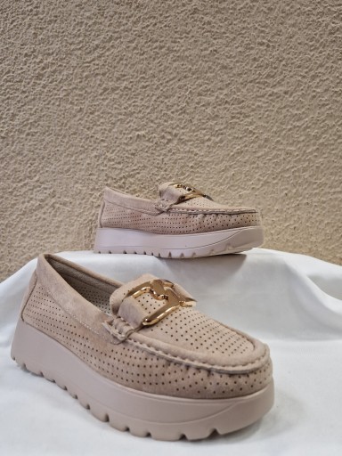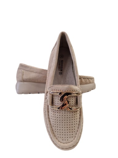 MOKASYNY GOODIN stylowe półbuty/mokasyny, wykonane z najwyższej jakości skóry ekologicznej zamszowej z wkładką ze skóry naturalnej. To doskonała propozycja dla Pań ceniących komfort i wygodę. Całość obuwia wykonana z dbałością o każdy szczegół i detal. Bardzo ładnie się prezentują i są bardzo lekkie. Model dziurkowany dzięki temu stopy będą oddychać, a z przodu ozdoba w postaci tzw. łańcucha