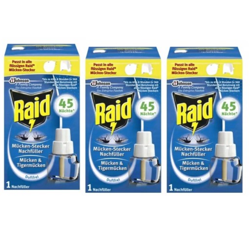 - Raid elektrofumigator z płynem owadobójczym przeciw komarom działa przez 45 nocy (stosowany 8h na dobę) nawet przy otwartych oknach i włączonym świetle. Opakowanie zawiera buteleczkę z płynem. Urządzenie chroni przed komarami pomieszczenie do 20m3. Optymalną ochronę uzyskuje się po 30 min. od włączenia.