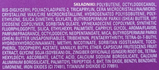 Powiększa usta i delikatnie koloryzuje, nadając im ponętny, złoty blask w stylu wet-look. Nie posiada błyszczących drobinek. Zawiera odżywcze masło shea oraz witaminę E, które dodatkowo pielęgnują i nawilżają usta.
